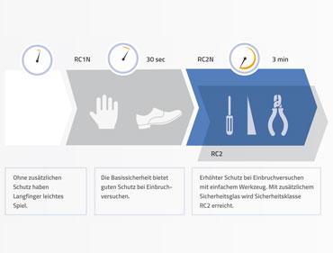 Neben der Grundsicherheit, die immer in unseren Elementen enthalten ist, bietet die HeKa bondico® Scheibenver- klebung eine erforderliche Komponente von ausgewiesenen und zertifizierten Sicherheitsfenstern und trägt somit als einbruchhemmende Maßnahme zum Objektschutz bei. Dauert ein Einbruchversuch länger als eine Minute, brechen viele Täter aus Angst, entdeckt zu werden, ab. Damit gilt: Je höher die Widerstandsklasse, desto höher der Einbruchschutz.
